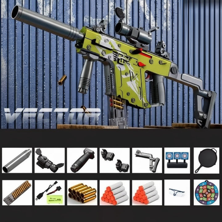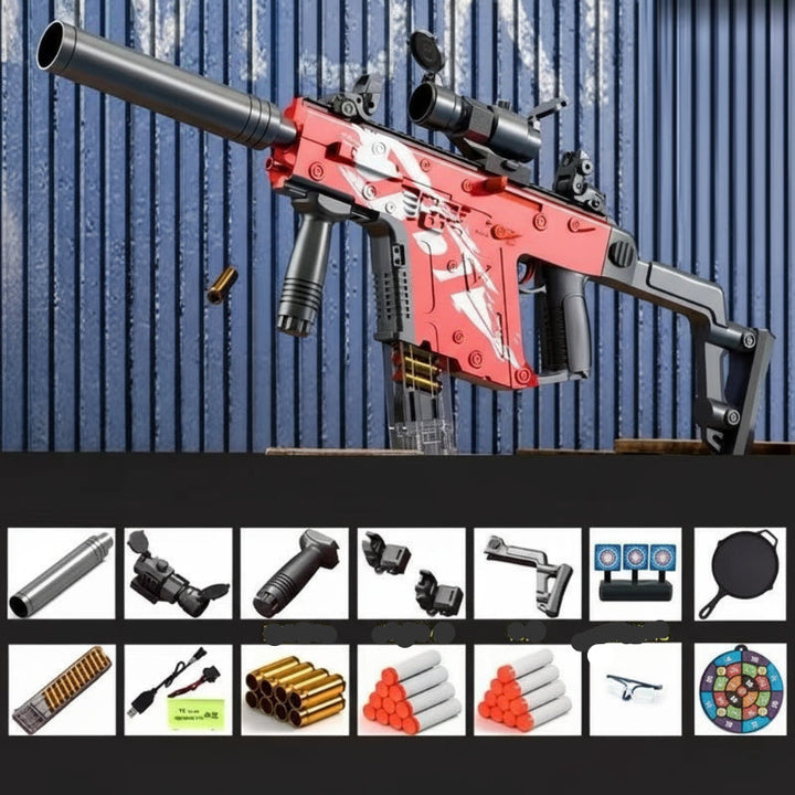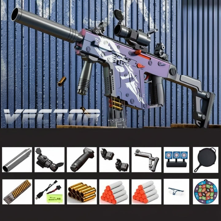 Meet the Handi Victor select-fire nerf SMG—a compact foam dart gun built for speed. It features a flexible selector for quick switching between manual and electric modes. Its folding stock, extra-long magazine, and stylish frame keep you agile in tight close-quarters combat, while the 6x magnification scope ensures accuracy at long range.