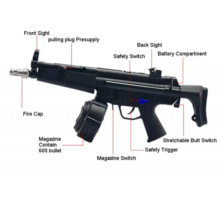 • Authentic MP5 Design: This 1:1 scale replica of the MP5 Gel Launcher perfectly recreates the look and feel of the original MP5, giving you a more immersive combat experience.