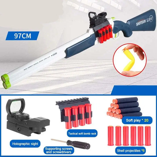 The S686 Nerf shotgun is a highly realistic foam dart shotgun based on the iconic S686 double-barrel shotgun. With its realistic folding barrel design, shell ejection mechanism, and safe soft dart ammunition, it immerses you in the world of Peacekeeper Elite.