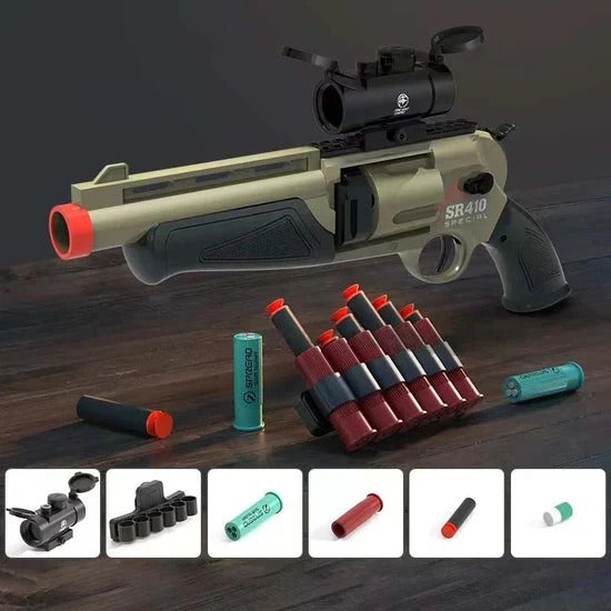 The SR-410 revolver shotgun is a lightweight, compact, and highly adaptable foam dart combat pistol, ideal for tactical combat and rapid-fire shooting. Its compact frame makes it a favorite among dedicated close-quarters Nerf combat fans.